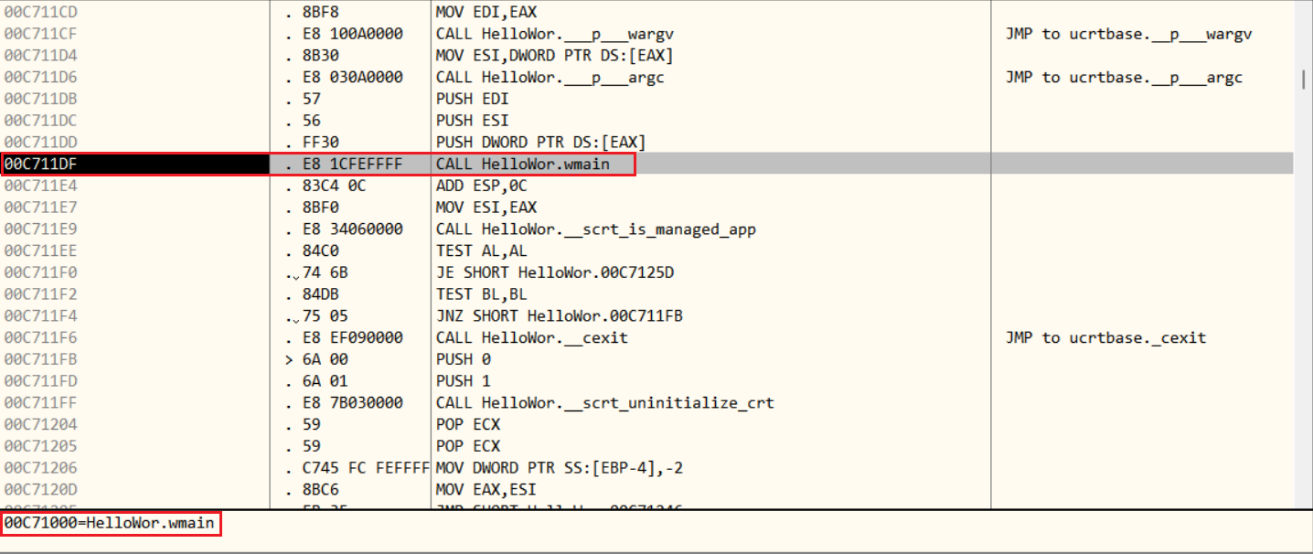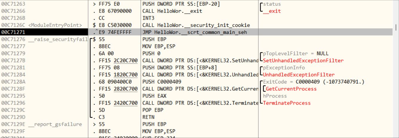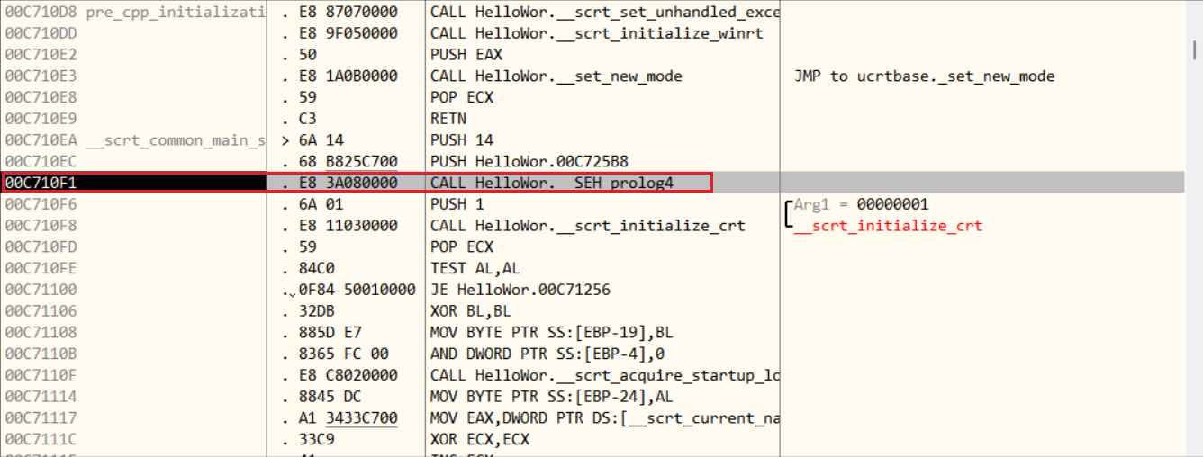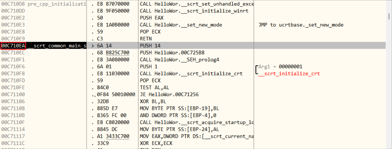 '00C71636=HelloWor.__security_init_cookie를 호출하고 00C710EA=HelloWor.__scrt_common_main_seh로 점프하라'
