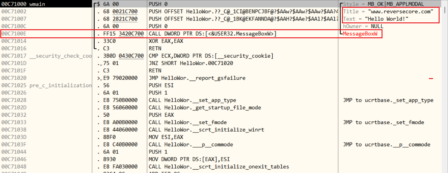 해당 함수로 들어가니 MessageBoxW() API를 호출하는 코드를 확인할 수 있었다. 이때 API의 파라미터는 "www.reverssecore.com"과 "Hello World!" 문자열이다. 따라서 C71000 함수가 main()함수이다.