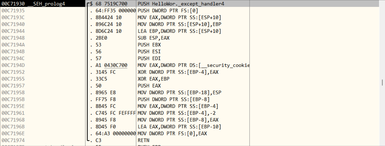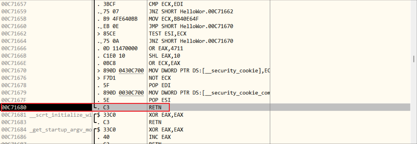 00C71636=HelloWor.__security_init_cookie 함수로 들어왔다.